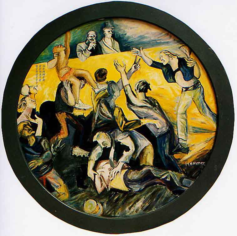 Mais que penser au sujet du tableau "Vanqueurs tous" paint par Birgitta-Renate Hemmer? Pourquoi est-il rond? - Serait-il rond comme un miroir? - Ou rond comme le monde? |