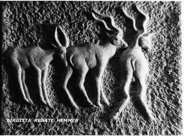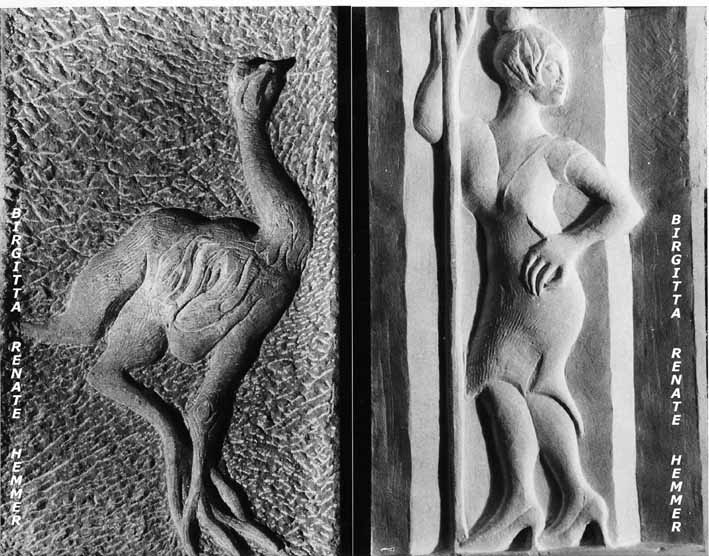 Emu und Dame 2 Reliefs: Stein von Massangis (79,5 x 45 x 7 cm) und Stein von Lens (79,5 x 48 x 6 cm) |